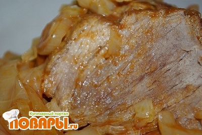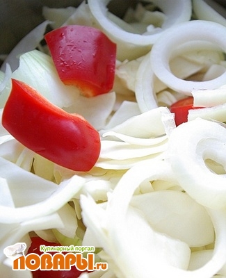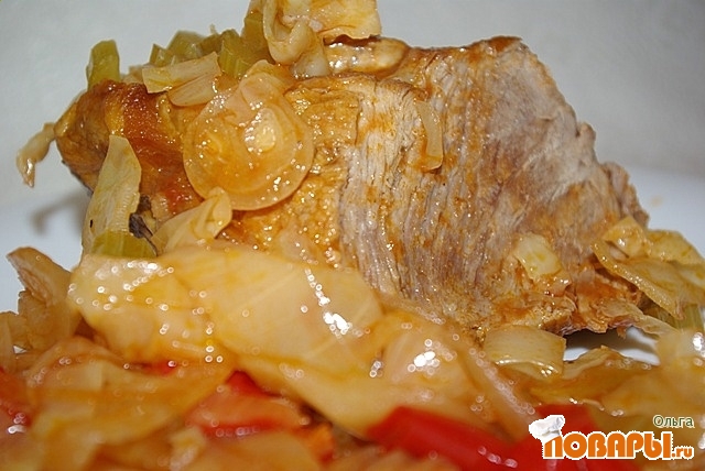 Мясо со всех сторон обжариваем на растительном масле, солим, перчим, укладываем на овощи. Поливаем соком со сковороды.