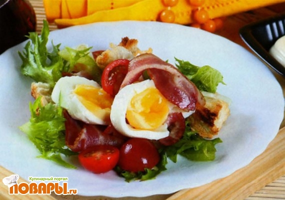 Приготовить заправку: соединить оливковое масло с соком лимона, добавить по вкусу соль и перец, перемешать. Салат нарвать руками на крупные кусочки, залить заправкой, добавить черри, нарезанные половинками. Выложить на салат бекон, багет, горячее яйцо. Украсить кольцами порея и несколькими каплями табаско.
