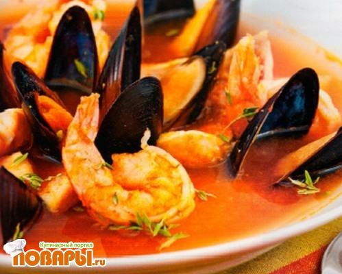 Содержимое кастрюли протереть через сито, смесь вновь влить в неё, добавить 1 ст. ложку масла. Быстро довести суп до кипения. Добавить рыбу и морепродукты. Снять с огня, посолить, поперчить, накрыть крышкой.