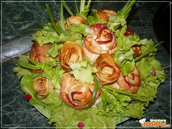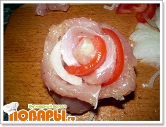 Делаем розочку из филе. Вырезаем небольшой брусочек из филе - это будет серединка. На пластину филе кладем пластину помидора и оборачиваем вокруг серединки, закрепляем зубочисткой. Берем еще пласт филе, на него кладем пластинку лука, оборачиваем вокруг нашего бутончика.
