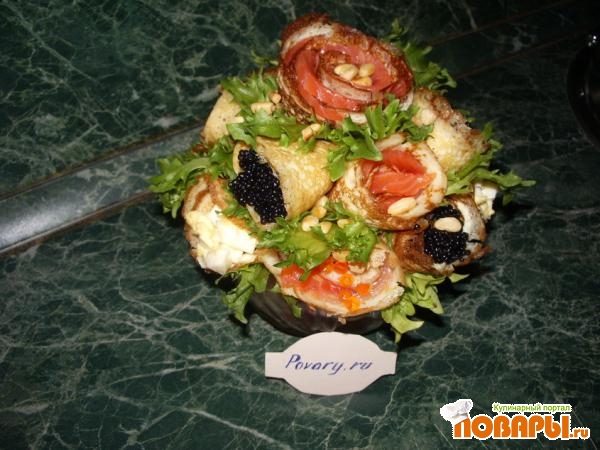 Каждый блин разрезаем на 2 половинки, каждую сворачиваем кулечком, выкладываем начинку. Начинка из яиц: яйца режем, чуть солим и добавляем майонез. Все остальные виды начинок в чистом виде :) Рыбку предварительно режем полосками.