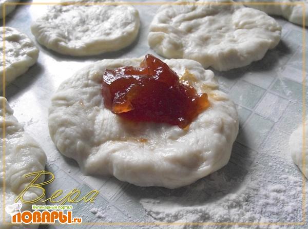 Разделить тесто на 15 частей, раскатать. Выложить на каждую булочку 1 ст. ложку повидла.