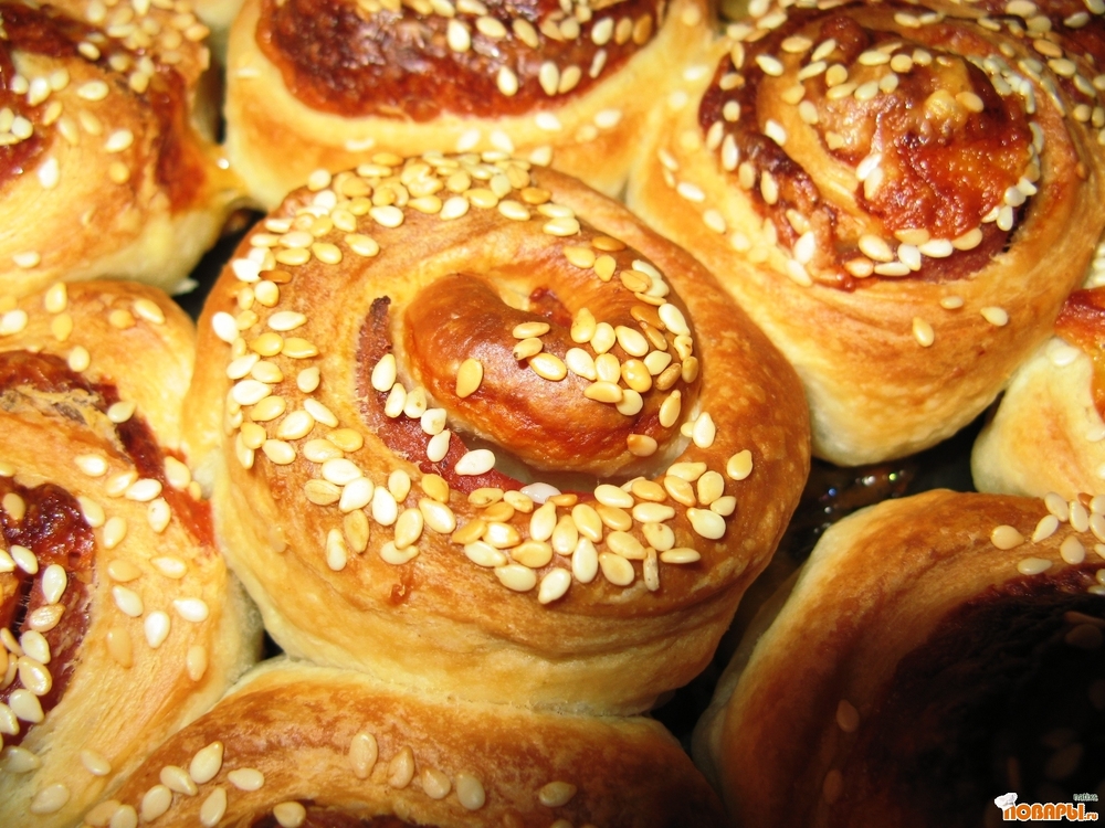 Слоенное дрожжевое тесто,раскатала потоньше.выложила на него ряд сыра,ряд колбасы,ряд сыра.затем все свернула в рулетик и порезала как колбасу. обмакнула каждый кусочек в кунжут и выпекала в духовке при 200*С примерно минут 25-30.