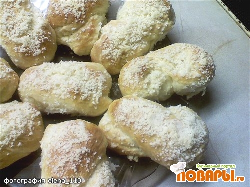 Разделить всё тесто на примерно равные кусочки,каждый кусочек скатать жгутом,соединить края и свернуть "восьмёркой". Выложить булочки на смазанный растительным маслом противень и оставить ещё на 20 минут.