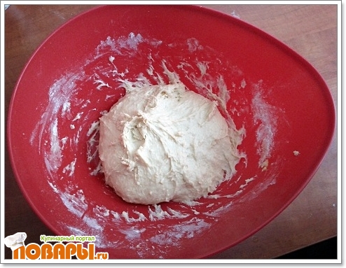 Тесто месите долго пока оно не перестанет липнуть к рукам(10-15 минут). Сформируйте шарик положите обратно в миску, накройте полотенцом поставьте в теплое место на 1 час - 1,5 часа. Тесто должно увеличится в 2 раза.