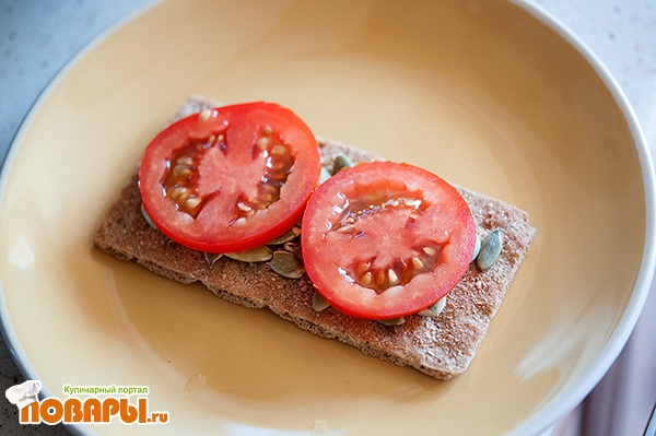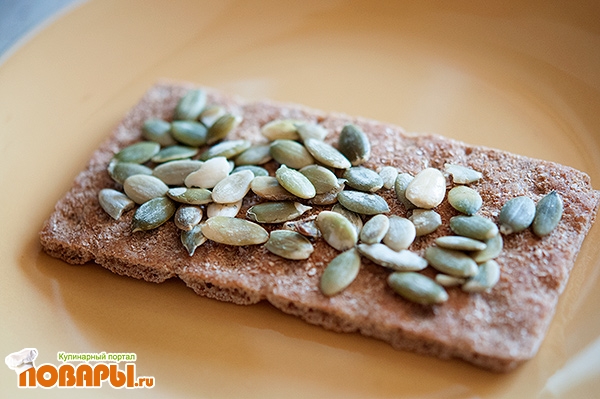 Берем хлебец, у меня он из ржаной муки с большим количеством клетчатки, (около 15%) и укладываем на него чищенные семена тыквы.