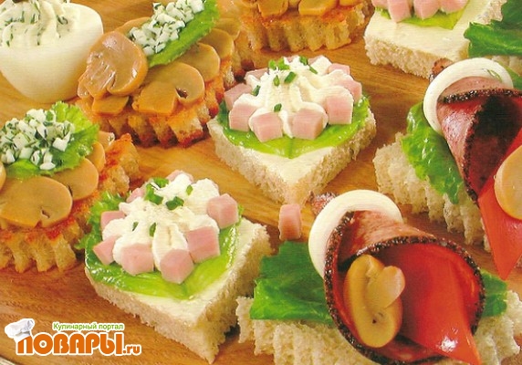 Положите на хлеб салат и посыпьте его рублеными яйцом и зеленью петрушки и укропа. Творог смешайте со сливками, солью и корнем хрена. На хлеб положите лист салата, а на него - творожную массу. Оформите ветчиной, нарезанной кубиками.