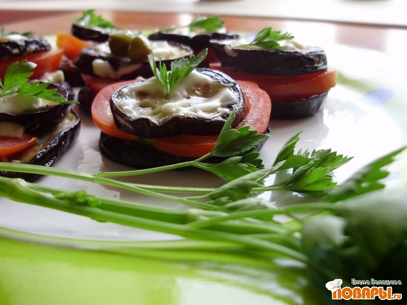 На кружок баклажана капаем майонезом или чем-нибудь с чесноком, потом кладем помидор, снова баклажан и каплю майонеза.