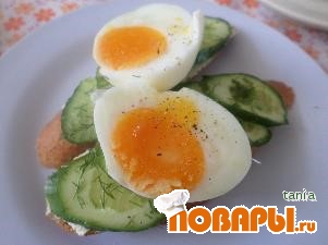 Яйца сварить "в мешочек" т. е. так, чтобы белок был свареный, а желток полужидким или мягким, не в крутую. Огурцы нарезать тоненькими кружочками, все ломтики хлеба намазать сыром, сверху разложить огурцы, потрусить укропом. Очистить яйца, осторожно разрезать пополам и уложить на огурцы, желтком к верху. Посолить и поперчить. Обычно эти бутеры подаю на завтрак - любимый завтрак моих деток, но бывает подаю для гостей, как канапе, но тогда использую кусочки хлеба поменьше, а куриные яйца заменяю на перепелиные.