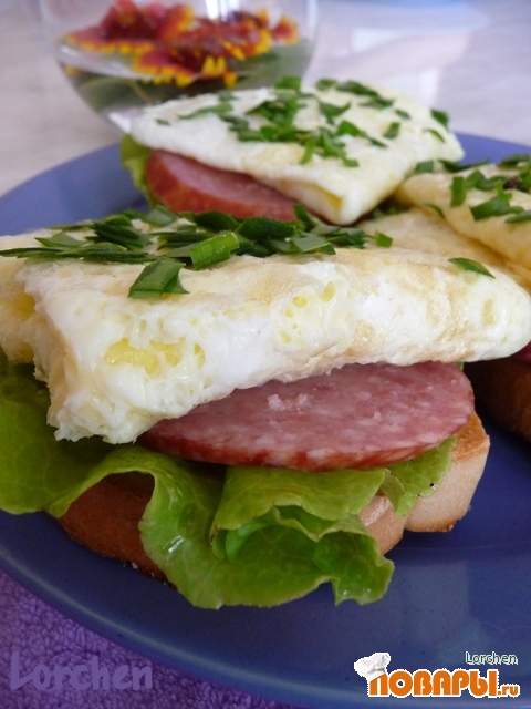На тост положить лист салата, затем ломтик салями, омлет. Посыпать мелко порезанным зеленым луком.