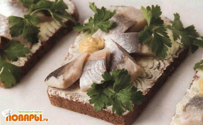 Хлеб нарежьте ломтиками, смажьте каждый маслом. Уложите на них по 1-2 кусочка филе сельди, смажьте их горчицей.