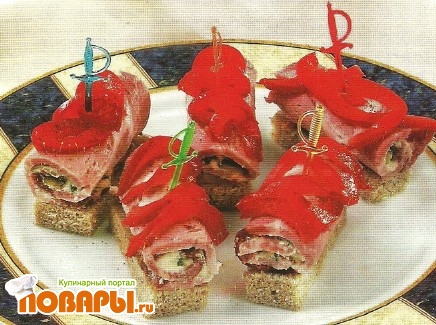 Ломтики хлеба разрежьте пополам, уложите буженину и оформите полосками маринованного перца. Сверху посыпьте молотым перцем.