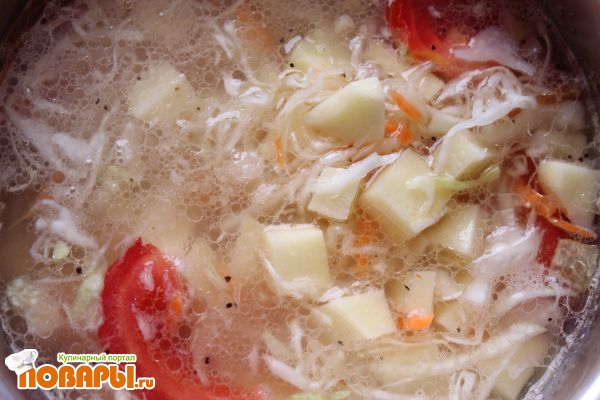 Поджаренный лук заливаем водой, добавляем картофель, помидоры и капусту. Солим, перчим. Закрываем крышкой и варим до готовности картофеля.
