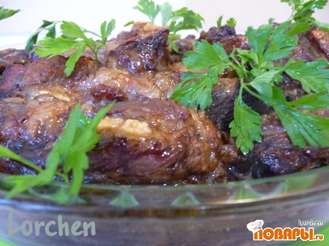 Маринад процедить, добавить туда 1 ст ложку сахара, уварить и полить готовые рёбрышки, снова поставить в духовку минут на 10.