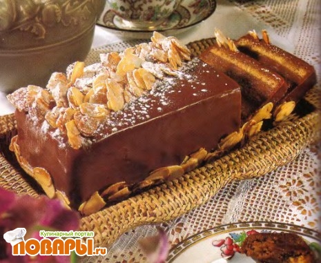 Разрежьте бисквит вдоль, чтобы получились пласты толщиной около 1 см. Покройте первый пласт тонким слоем растопленного шоколада и положите его этой стороной на тарелку такого же размера. Сверху смажьте пласт пуншем, используя для этого кисточку, а затем покройте тонким слоем глазури. Повторите эту операцию со всеми остальными пластами бисквита и поставьте для застывания в холодильник (на 3-5 мин). Сверху покройте торт оставшейся глазурью, подогретой на водяной бане. Глазурь выровняйте сверху лопаткой, посыпьте какао-порошком, воткните миндаль и подавайте.
