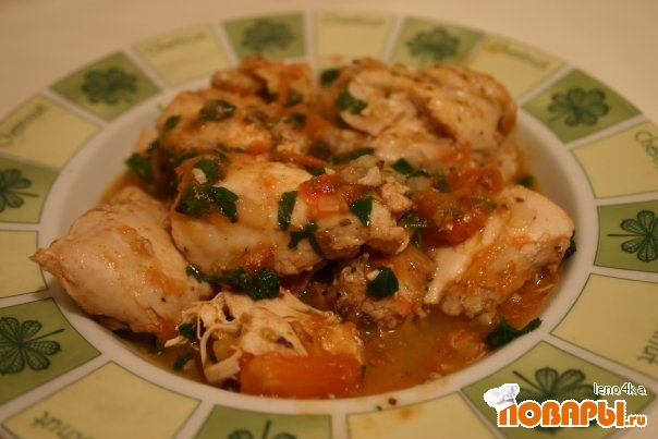 Нарезаем помидоры, достаточно крупно. Минут через 10-15 добавляем к курице лук, продолжаем тушить, перемешивая, еще минут 5. Следом кладем помидоры, перемешивая тушим минут 30, жидкости должно быть достаточно, но не много, лишнюю жидкость по необходимости убираем. Говотовим травки для добавления к блюду. Через 30 минут блюдо солим.