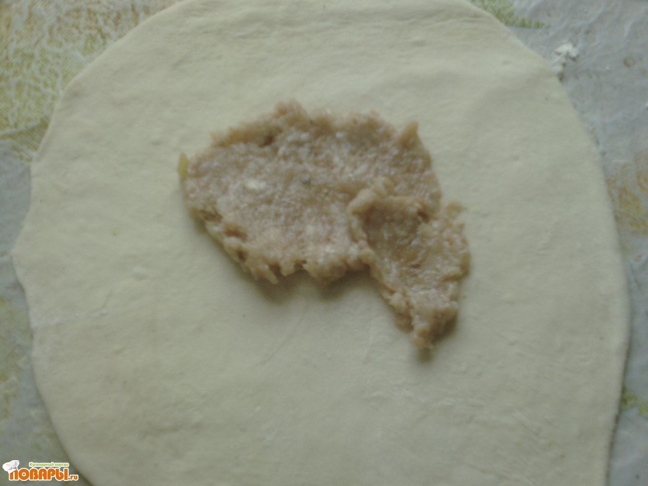 На середину теста укладываем мясо, не жалейте, чем больше - тем вкуснее, но и не перестарайтесь, что бы тесто не порвалось. Распределяем тесто равномерно по одной половине лепёшки из теста.