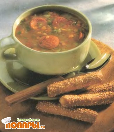 Добавить чечевицу, томаты, лавровый лист, бульон и кусочки сарделек. Довести до кипения, убавить огонь, накрыть крышкой и варить на медленном огне до мягкости чечевицы. Вынуть лавровый лист, посолить и поперчить. Подавать с кунжутными хлебными палочками.
