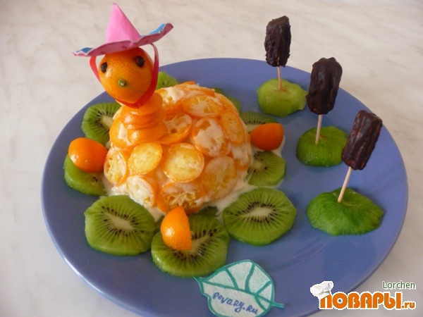 На киви выкладываем наш салат - это "тело" черепахи, делаем ей из клементин "голову" и "лапки".