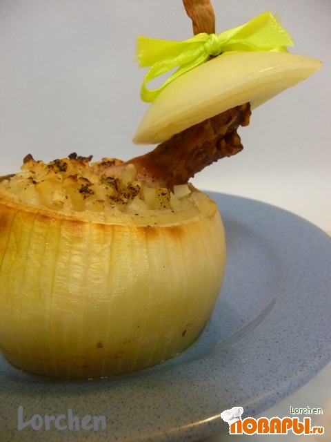 В лук поставить голень и насыпать начинку.