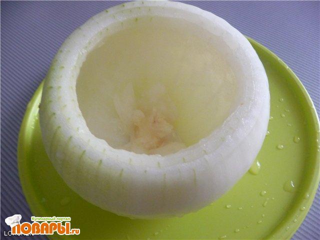 У лука отрезать верхушку, почистить. Оставить 2 слоя, остальное аккуратно удалить при помощи ножа и ложки.