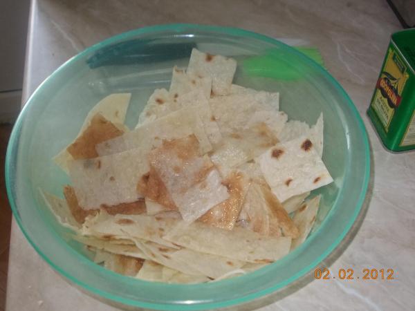 Выложить кусочки лаваша на противень в один слой. Если лаваша много разделите на несколько порций.