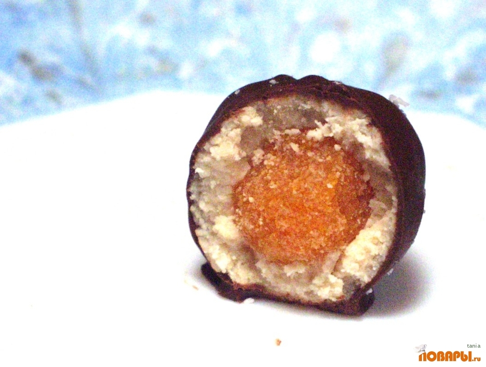 Промытую курагу перемолоть, слегка перемесить руками и сформировать из нее маленькие шарики, размером с лесной орех. Обернуть шарики кокосовой массой. Готовые шарики обмокнуть в растопленном шоколаде.