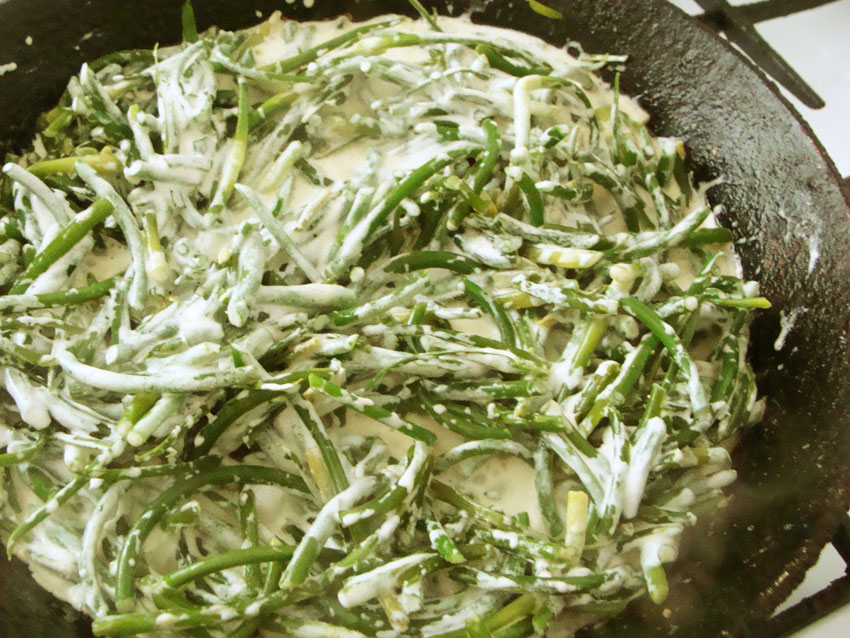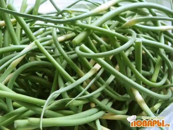 Ну, все что есть и что съедобно, можно использовать. Начался дачный сезон, и вот первый урожай, чесночные стрелки. Собираем, моем, нарезаем как можем, обжариваем на растительном масле, солим и в конце добавляем сметану. Протушиваем пару минут и овощная закусочка готова.