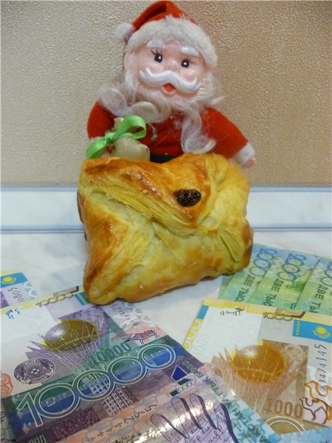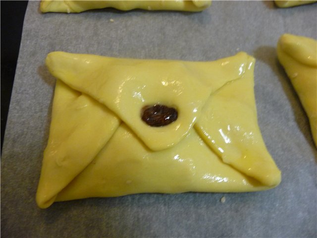 Разморозить тесто, немного раскатать. Положить начинку и соединить углы теста, придав форму открытого кошелька. Затем кошелек закрыть и защепить (плотно вдавливая) ягодкой вымытого и высушенного изюма.