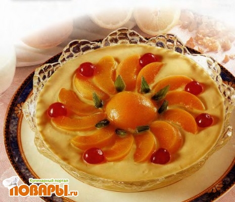 Непосредственно перед подачей выложите в центр вазы половинку персика, нарежьте ломтиками два отложенных персик, и расположите вокруг половинки так, чтобы получился цветок подсолнуха. Украсьте засахаренными вишнями и лимонными цукатами.
