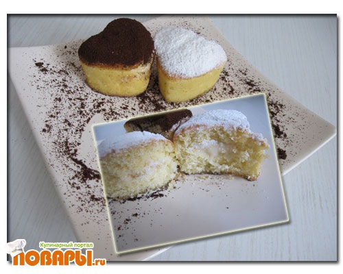 Формочки для выпекания, у меня были силиконовые сердечки, смазать сливочным маслом. Бисквит поднимается высоко, поэтому заполняем формочки на 1/3 тестом. Выпечка 30 мин. Во время выпечки не открывайте духовку, выпекать на среднем огне. Проверить готовность зубочисткой.