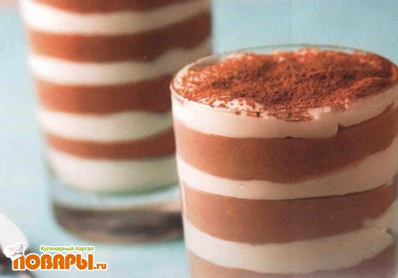 В вазочки выкладывайте, чередуя, по 1-2 чайные ложки белой и темной массы. Поставьте вазочки в холодильник на 1-1,5 часа.