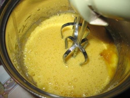 Яйца взбить с сахаром и ванилью (если ванильный сахар - 1 упаковка, если ванилин - на кончике ножа).