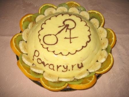 Бананы нарезать кружочками, апельсин и киви - полукольцами. Выложить вокруг десерта сначала бананы, затем киви и апельсин в виде лепестков.