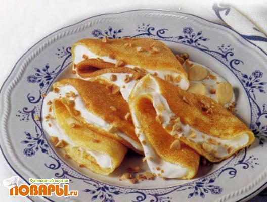 Взбейте во второй миске йогурт с медом и помажьте этим кремом каждый блинчик, сверните и украсьте измельченным жареным миндалем.