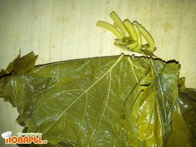 Сначала обрежем стебельки у солёных виноградных листочков. Кладём их в кастрюлю с водой для того чтобы соль вышла в воду.