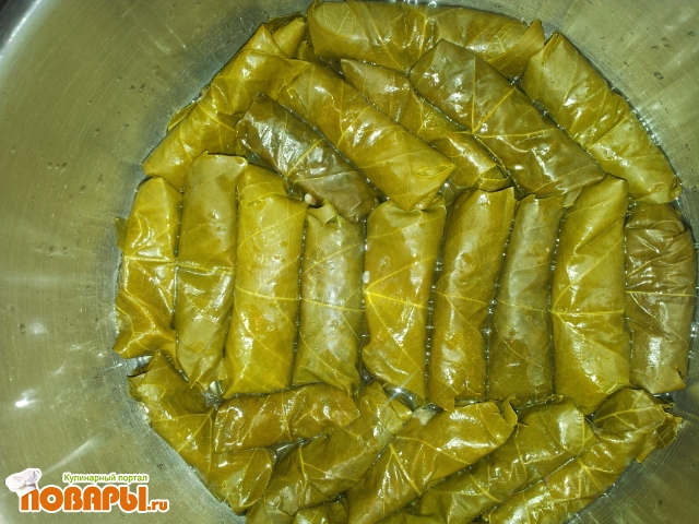 Укладываем в широкую кастрюлю, предварительно на дно постелив пару листочков, чтоб не пригорело. Наливаем воды столько, чтоб только еле прикрывала долма.