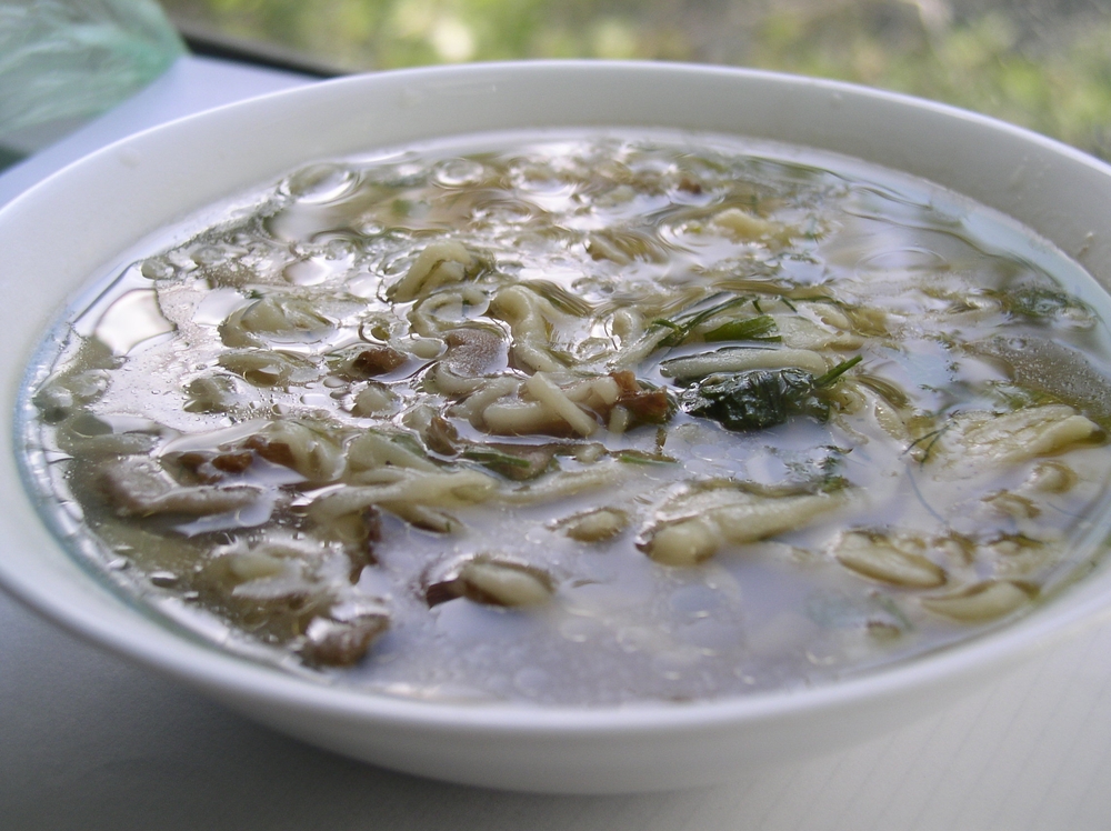 Грибы замочить, из курятины сварить бульон, мясо вынуть, сварить в этой воде грибы. Замесить из яйца, соли и муки крутое тесто, нарезать на кусочки, каждый кусочек очень тонко раскатывать и нарезать на тонкую лапшу.