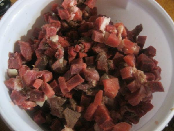 Один край завязать, набить начинкой и так же завязать. Кишку можно надеть на специальную насадку для мясорубки.