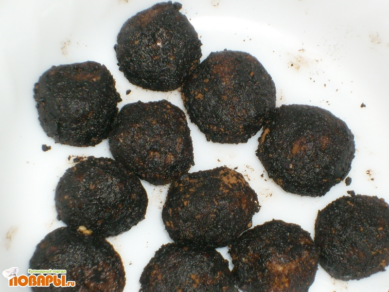 Через ручную мясорубку ( электромясорубку просто можете поламать ) пропустить ядра грецкого ореха вместе с очищенными от косточек финиками. Тщательно руками вымесите до хотя - бы относительно однородной массы полученное. Если надо (финики пересушены) добавьте минимально (1 или несколько столовых ложек) любого натурального сока или просто воды . Вылепите конфеты как хотите. Обваляйте их в кэробе. уже готово! Лучше поставить в холодильник.