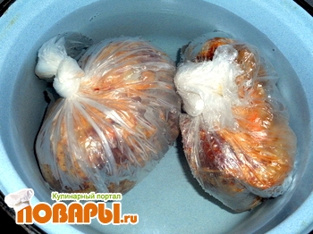Разложить смесь по двум целлофановым пакетам, сложив их один в один, завязать. Кипятить в кастрюле пару часов. Огонь должен быть минимальным.
