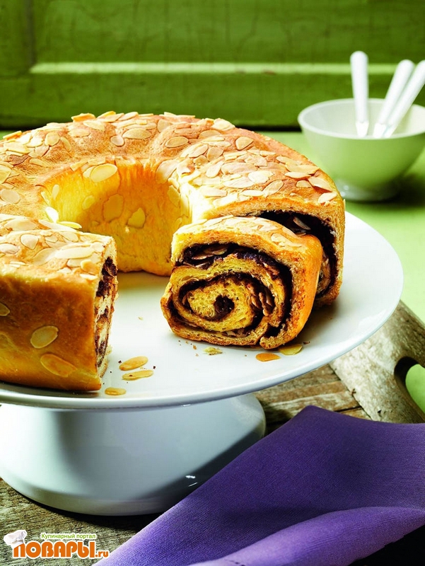 Начинка: немного подогреть нугу на водяной бане на слабом огне до получения вязкой, упругой консистенции. Еще раз немного помесить тесто на рабочей поверхности, слегка посыпанной мукой, раскатать в форме прямоугольника (около 55 x 30 см). Смазать прямоугольник нугой и равномерно посыпать миндалем. Скатать в рулет с продольной стороны. Уложить рулет в форму в виде кольца. Покрыть тесто и оставить в теплом месте, пока оно заметно не увеличится.