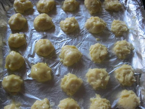 На противень, смазанный растительным маслом, при помощи кондитерского шприца или ложки выложить тесто шариками диаметром 2 – 3 см.