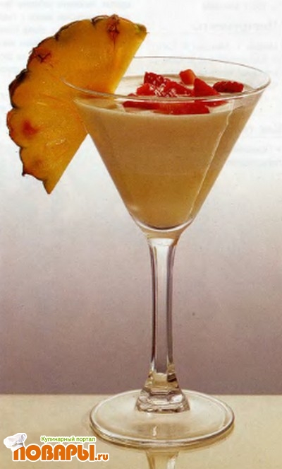 Распределите десерт по бокалам и поставьте в холодильник до момента подачи. Украсьте десерт порезанной на половинки клубникой и ломтиками ананаса.