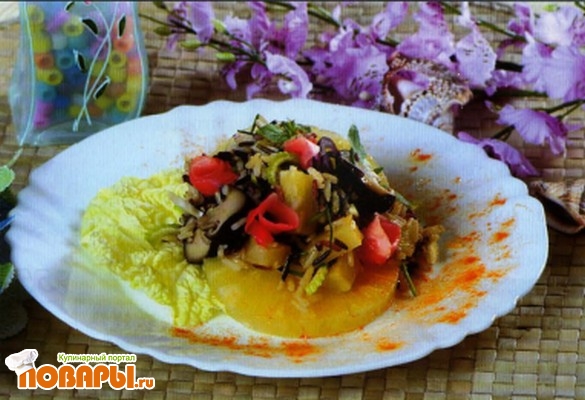 Рис отварить в подсоленной воде до готовности, откинуть на сито, дать стечь воде. С грибов и ананасов слить жидкость, нарезать небольшими кусочками. Сельдерей нашинковать тонкими ломтиками. Маринованный имбирь мелко порубить.