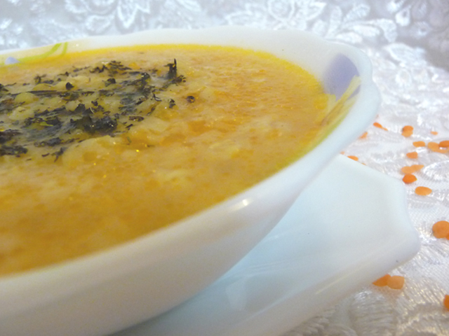 Подавать суп полив лимонным соком и посыпав сушёной мятой.