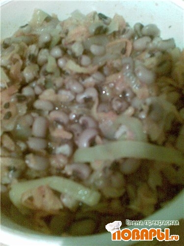 Всё смешать с отварной фасолью и дать хорошо прогреться. Заправить чесноком+сок лимона или уксуса(по вкусу), солью и перцем.