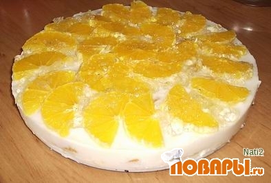 Желатин растворить в горячем соке с водой, влить в остальные компоненты. Размешать и поставить на полчаса в холодильник, чтобы масса "схватилась" и не вытекла сквозь щели в разъёмной форме. Выложить массу на печенье с фруктами. Поставить на 2 часа в холодильник для застывания. Очистить 2 апельсина, порезать на ломтики и украсить торт. Провести острым ножом по краям торта, аккуратно снять стенки формы.