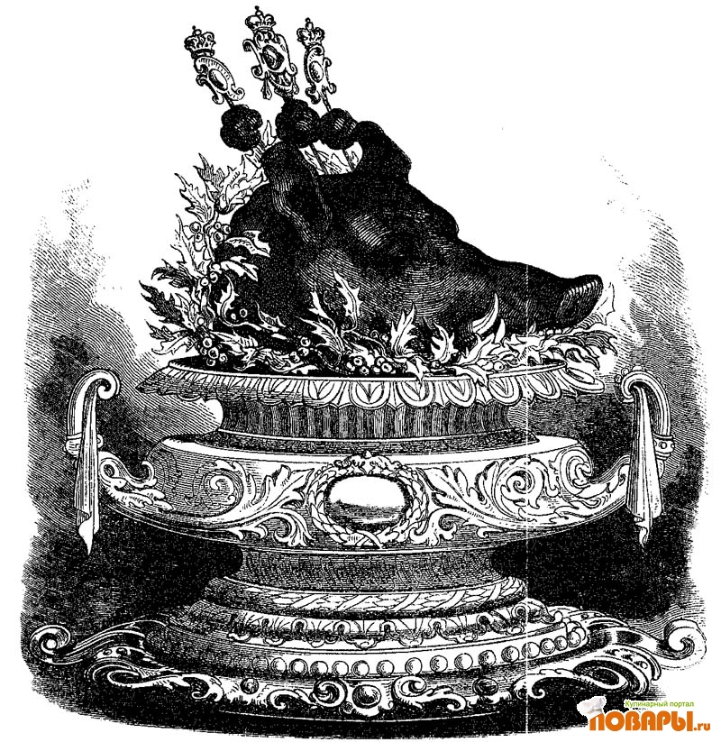 Голову осушите, протрите и осыпьте столовой ложкой смеси четырех приправ (перец, гвоздичка, мускатный орех и имбирь. (Иногда вместо перца - ямайский перец, а вместо имбиря - корица. - G.V) Вложите в голову изнутри слой фарша пяти сантиметров толщины, сверху кладите слой хорошо смешанной крупно рубленой начинки. Так кладите слой за слоем фарша и начинки, пока все не поместится. Заверните голову в материю, чтобы придать ей форму, и сварите с морковью, луком и сельдереем в мадере (vin de Madere), пока не сварится.