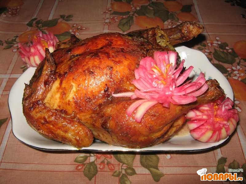 Запекать в разогретой до 180° духовке 90 минут. Время от времени курочку нужно поливать выделяющимся соком.